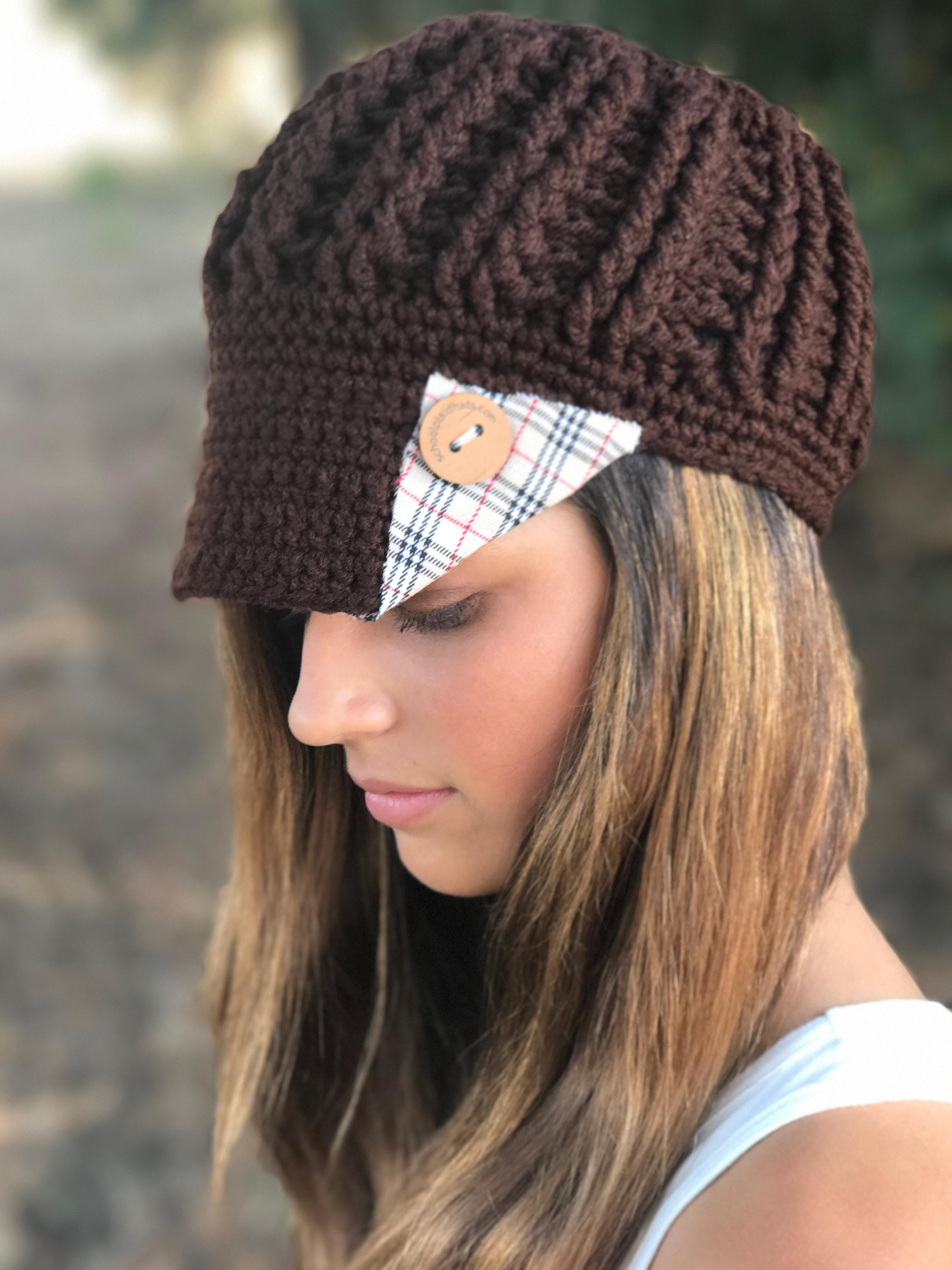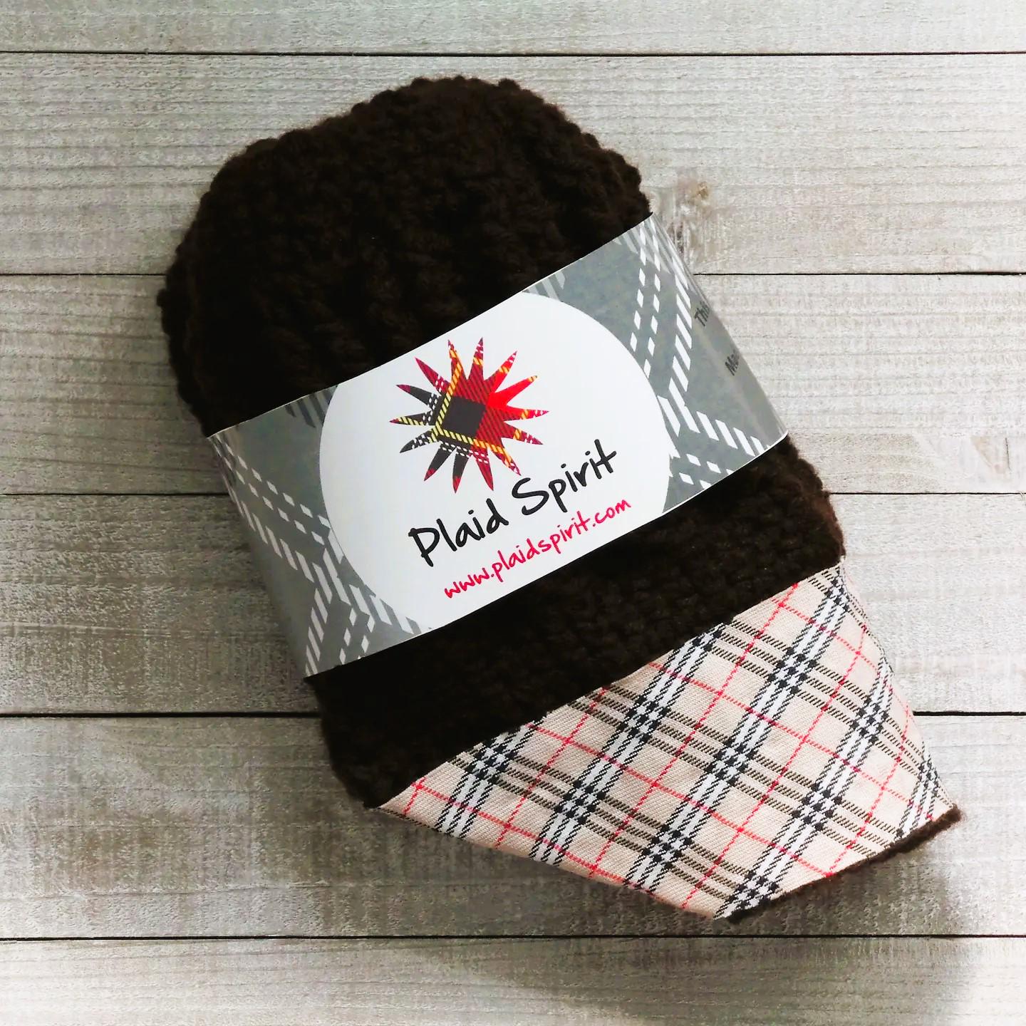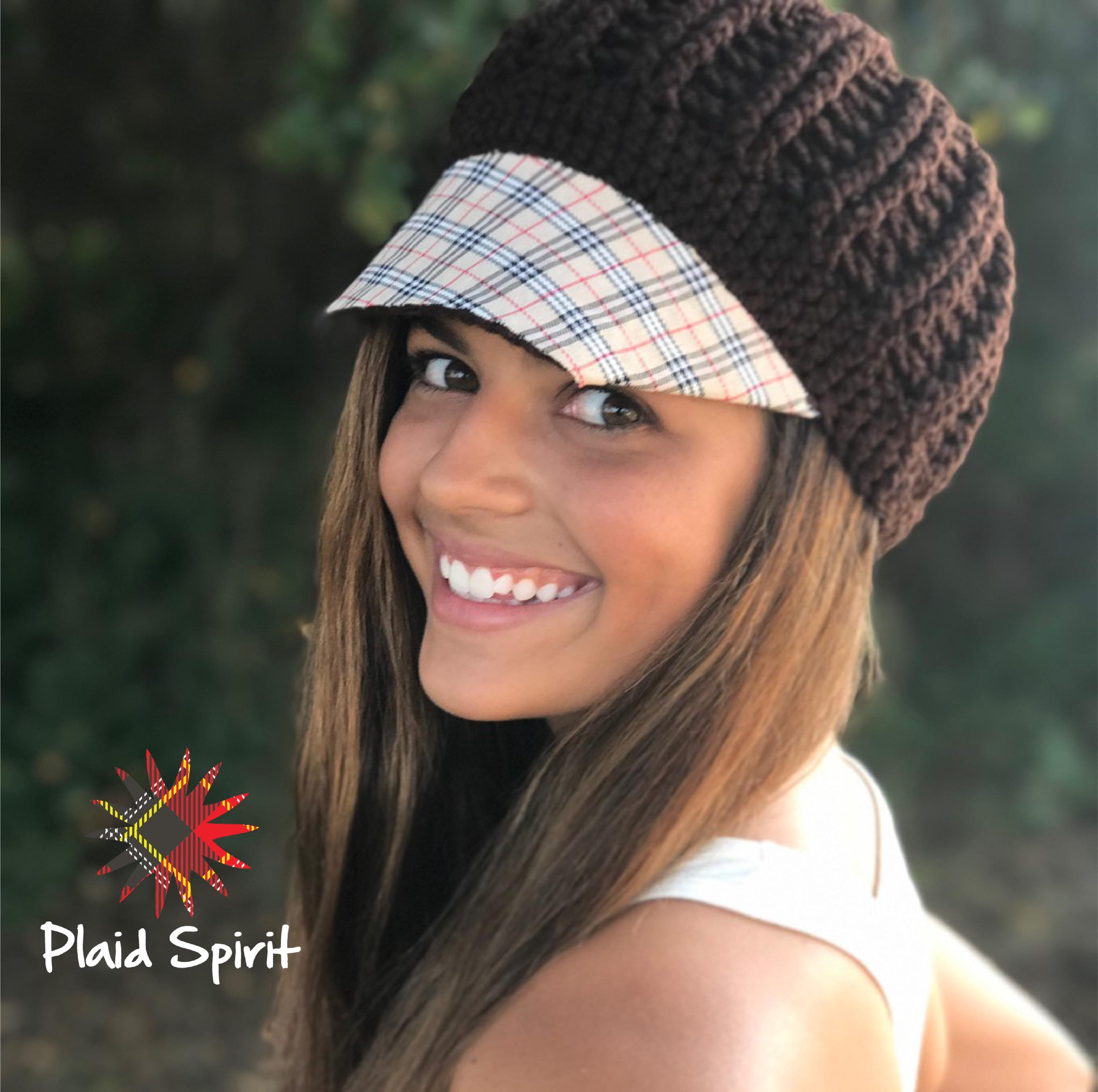 Chocolate brown reversible hat with black & tan tartan check plaid fabric brim. This hat is reversible - wear it one way to show off its fabric lined brim with the corners turned up and wood buttons; or turn it to the other side for a full fabric lining with the curved baseball cap shaped brim
