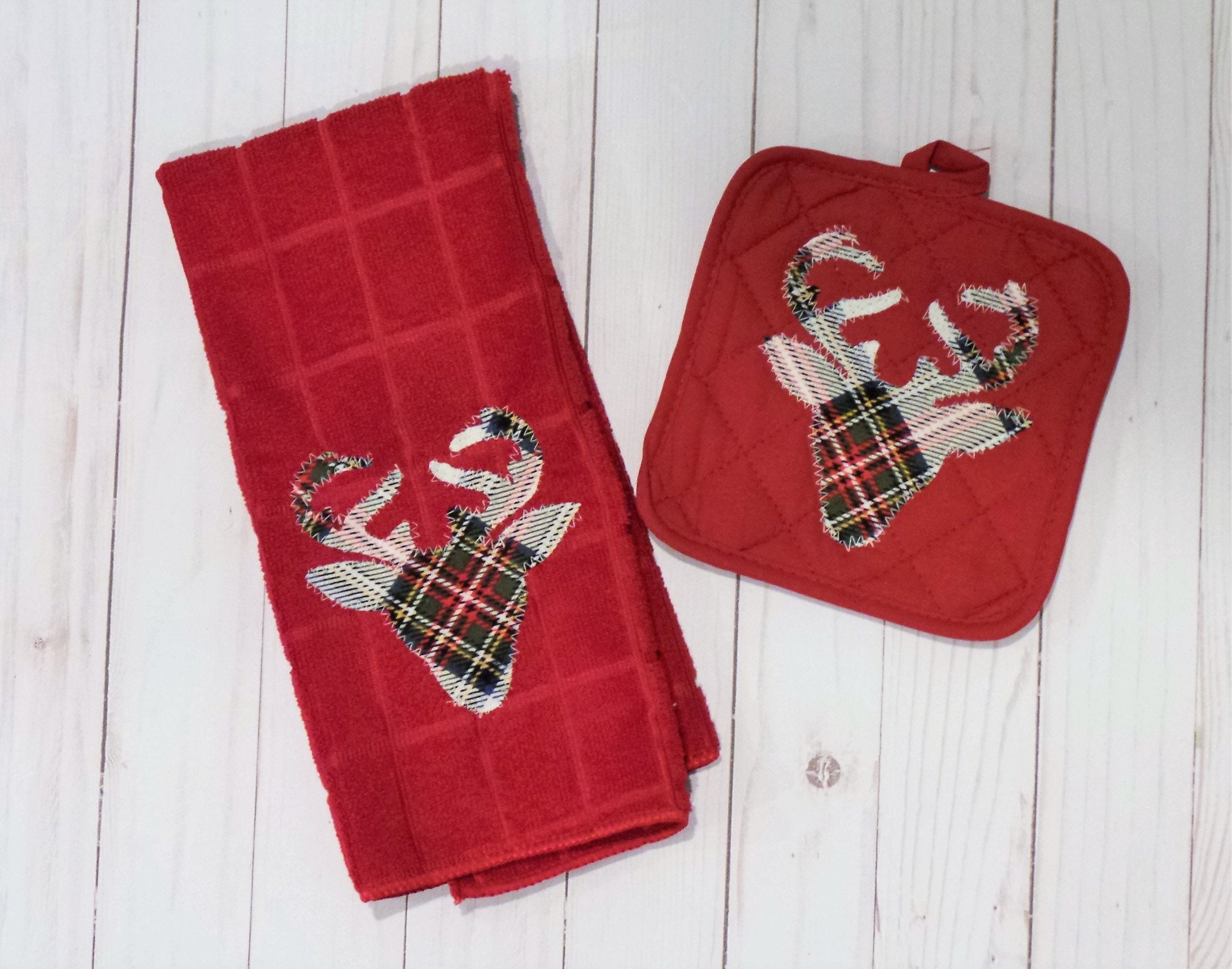 Deep red potholder and kitchen towel set with tartan plaid reindeer silhouette decoration. Reindeer is created from Christmas tartan fabric and sewn on to the towel and potholder