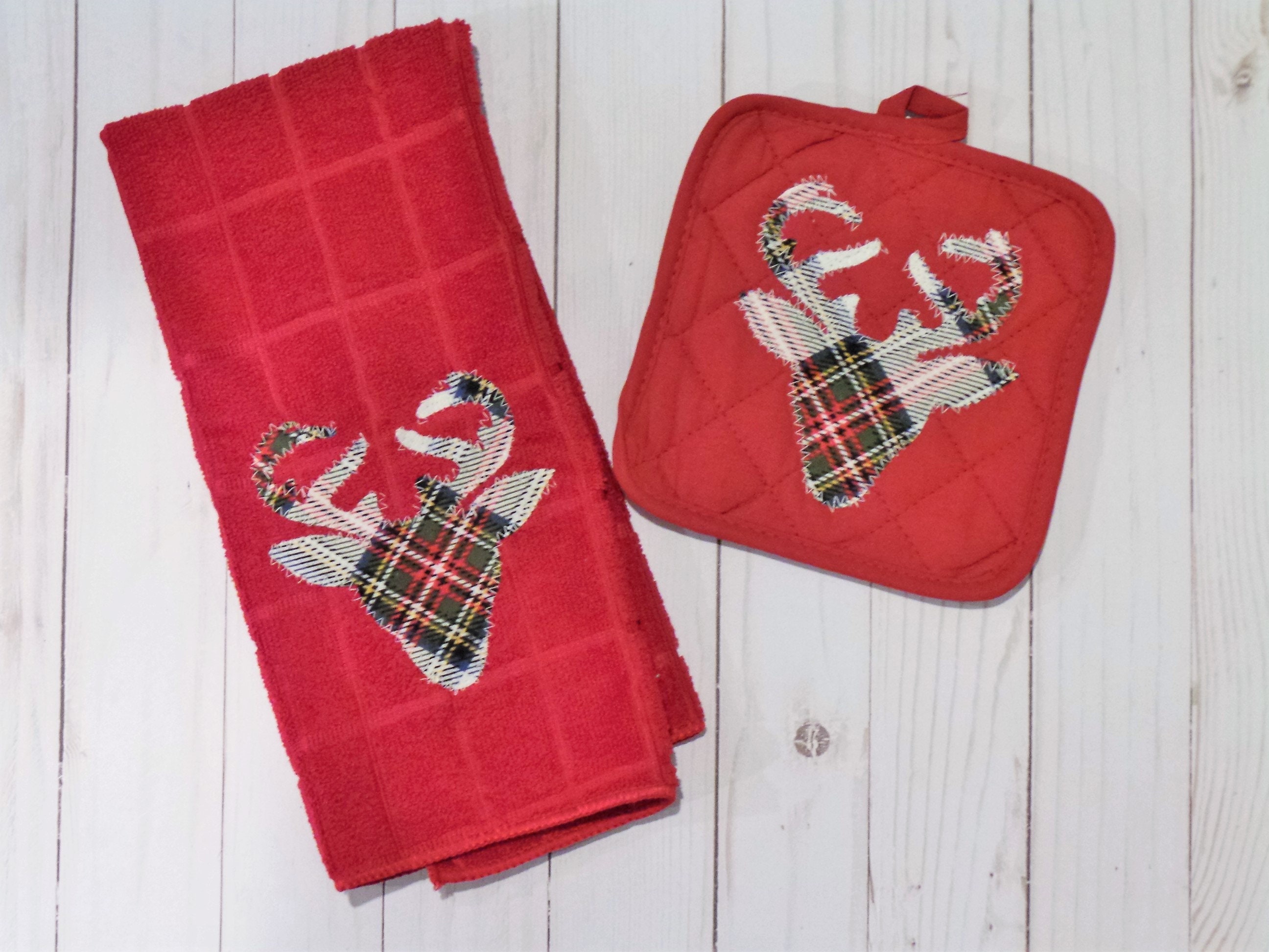 Christmas potholder & towel set with tartan plaid fabric reindeer; hostess gift; teacher gift; holiday