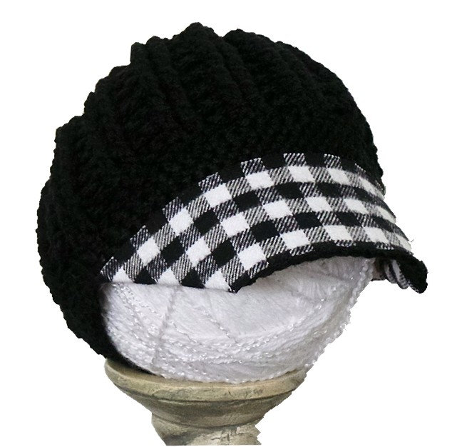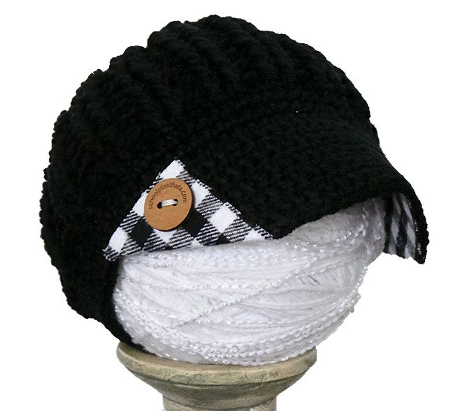 Cabled reversible hat in black with black & white buffalo check plaid fabric brim. This hat is reversible - wear it one way to show off its fabric lined brim with the corners turned up and wood buttons; or turn it to the other side for a full fabric lining with the curved baseball cap shaped brim