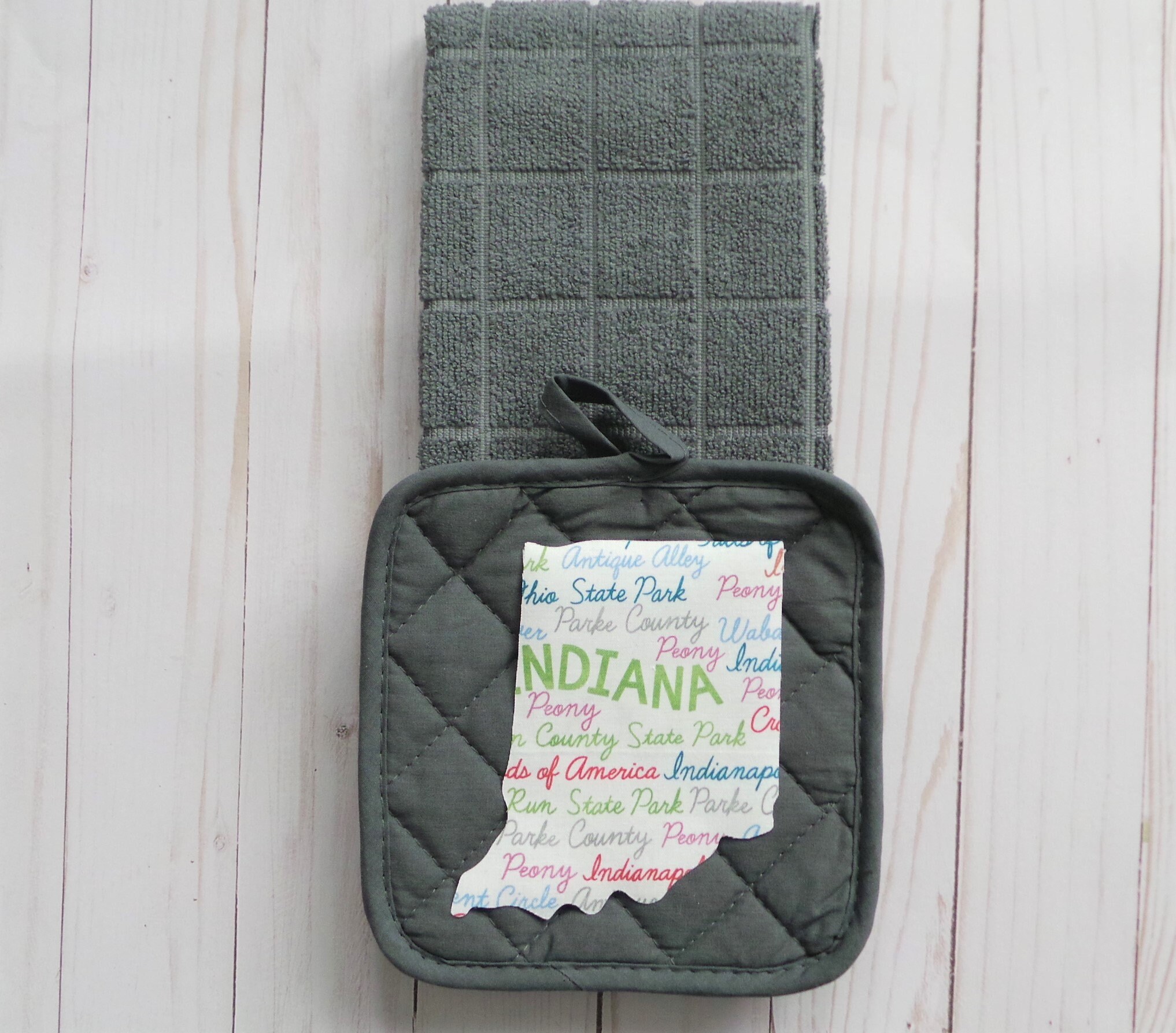 Gray quilted potholder and kitchen towel set with the state of Indiana shape cut from fabric listing cities and landmarks in Indiana. State cutout will be sewn onto the front of potholder and towel.